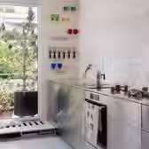 Renovated apartment situated in one of Ljubljana's most prominent modernist neighbourhoods by architect Ajda Žagar. The intervention focused on opening up the layout and creating a fluid connection between the entrance, kitchen, and living area. New installations, flooring, and windows were added, while custom storage solutions and modest materials kept the budget efficient.